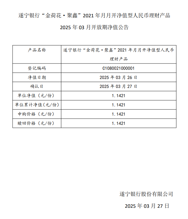 “金荷花·聚鑫”2021年月月开净值型人民币理财产品2025年03月净值公告