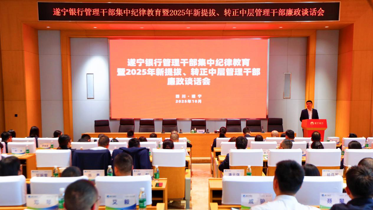 为进一步强化全行管理干部的纪律规矩意识和廉洁从业理念,筑牢拒腐防变的思想道德防线,10月28日,遂宁银行召开管理干部集中纪律教育暨2025年新提拔、转正中层管理干部廉政谈话会。市纪委监委驻遂宁银行纪检监察组组长、行党委委员、纪委书记蔡建敏出席会议并做廉政谈话。