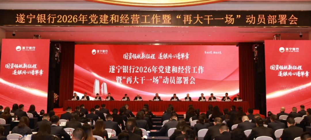 近日,遂宁银行2026年党建和经营工作暨“再大干一场”动员部署会在遂宁OCG顺利召开。党委书记刘红军出席会议并讲话,党委副书记刘光辉主持会议。会议深入学习贯彻党的二十大和二十届历次全会精神,全面落实省委、市委各项决策部署,扛牢“实业兴市、引客入遂”两面大旗,积极响应市委“再大干一场”号召,全面总结2025年改革攻坚与经营发展成效,科学分析当前发展形势,正式确立“1331”高质量发展总体工作思路,系统部署“四大关键战役”,进一步凝聚全行共识、汇聚奋进力量,推动国有化改革后高质量发展开好局、起好步,共筑精品银行美好未来。全行领导班子、高级管理人员,总行各条线各部门、各分支机构主要负责同志参加会议。