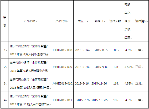 截止2015年7月31日,遂宁市商业银行尚在存续期的理财产品见下表: