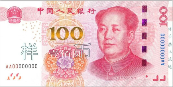 七、票面正面毛泽东头像、国徽、“中国人民银行”行名、右上角面额数字、盲文及背面主景人民大会堂等均采用雕刻凹印印制,用手指触摸有明显的凹凸感。